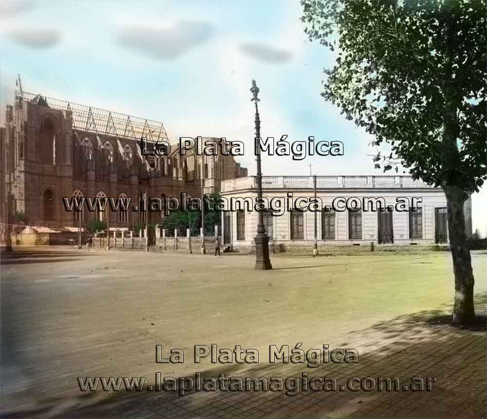 En la foto de 1884 tomada por Samuel Boote coloreada, se aprecia la hoy calle 7 y la construcción de la Legislatura, las jóvenes plantas de palmeras y a lo lejos a la derecha la construcción de la estación de ferrocarril 19 de Noviembre que posteriormente con los años sería el pasaje Dardo Rocha. La ciudad estaba naciendo. El original es cortesía del señor Jorge Gomes.
