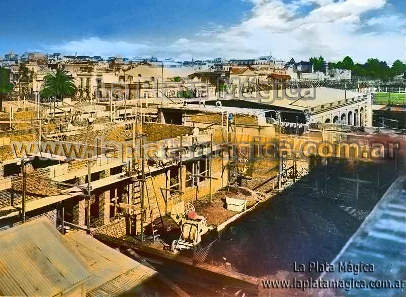 Trabajos de construcción en el año 1933, en lo que sería el futuro Colegio Industrial en el sector de calle 57 y 1. Se aprecia a la derecha el campo de juego, a lo lejos la jefatura de Policía y la edificación de la época.